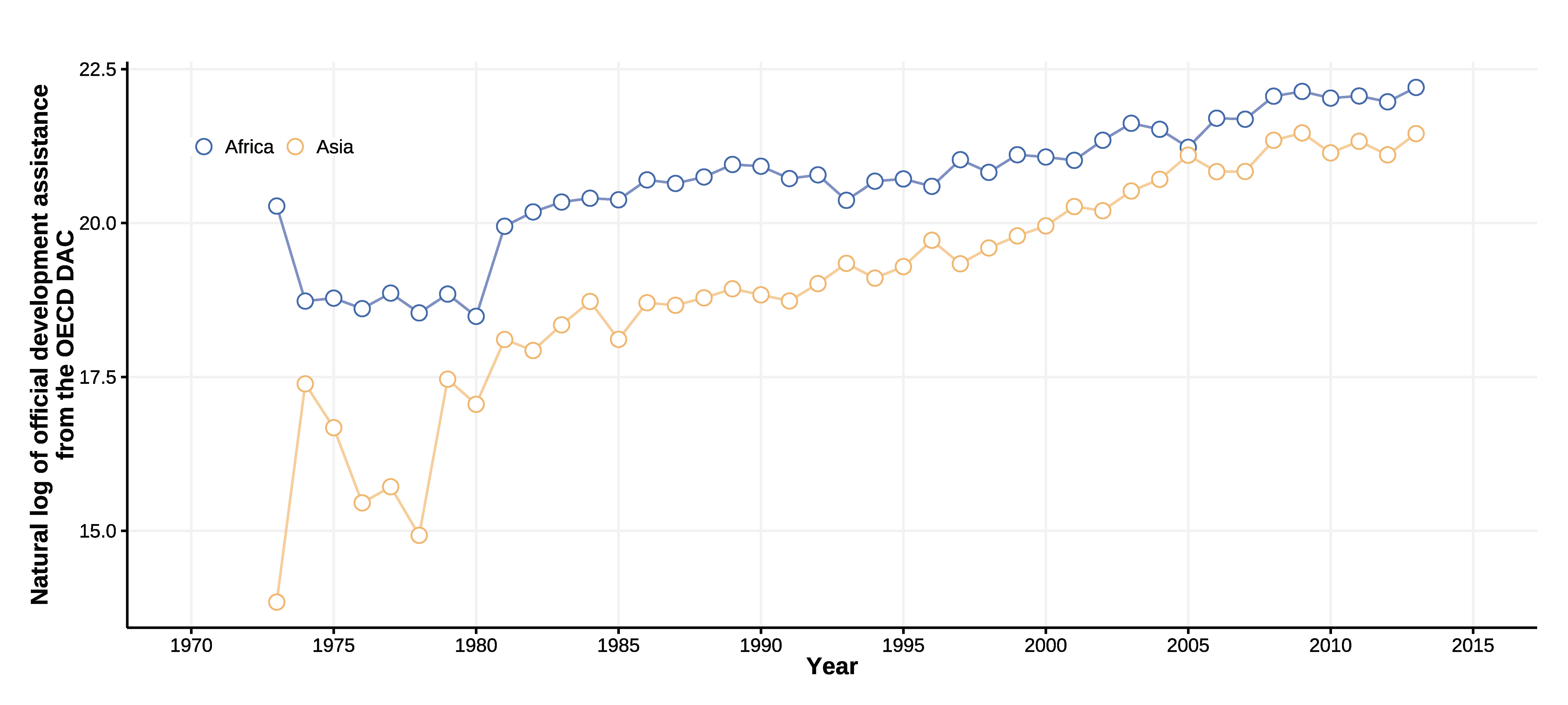 Figure 3 depicts the natural logged distribution of net official development assistance (ODA) from the Organization for Economic Cooperation and Development (OECD) Development Assistance Committee (DAC) to African and Asian countries between 1966 and 2021. Women’s cabinet share in African and Asian countries is increasing at a similar rate, as shown in Figure 2. Using aid data, it is difficult to account for differences in women’s cabinet share between Africa and Asia.